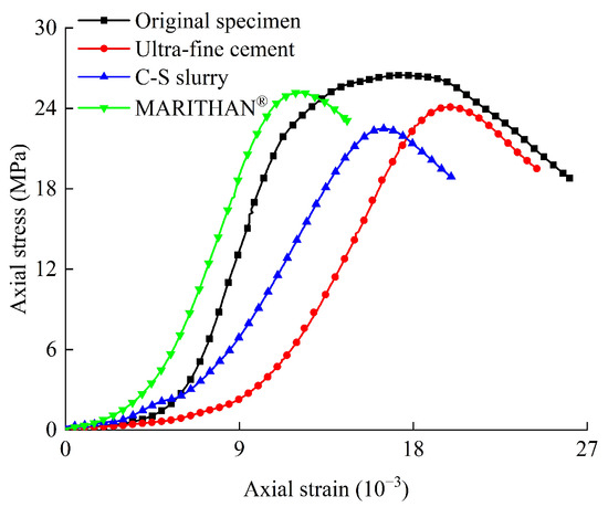 The stress–strain curves of the intact specimen, ultra-fine cement grouting specimen, C-S grouting specimen, and MARITHAN® grouting specimen are shown in Figure 7. It can be seen that the stress–strain curves of the specimens after grouting reinforcement are similar to the curves before grouting, and they all experience a peak from the elastic phase to the destructive phase. The intact specimen shows ductile damage characteristics during uniaxial loading, and the stress–strain curves do not show obvious peaks; the grouted specimens show brittle damage characteristics during uniaxial loading, and the stress–strain curves decrease more rapidly when reaching their peak strength.