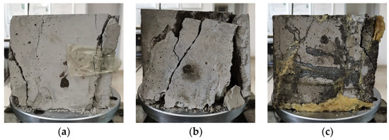 Damage pattern of grouting specimens. (a) After injection of ultra-fine cement slurry; (b) After injection of C-S slurry; (c) After injection of MARITHAN®.