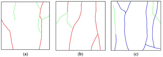 Crack extension of specimens. (a) The ultra-fine cement grouting specimen; (b) The C-S grouting specimen; (c) The MARITHAN® grouting specimen. Note: the blue color represents the original rupture surface, the green color represents the nascent rupture surface, and the red color represents that the original rupture surface coincides with the nascent rupture surface.