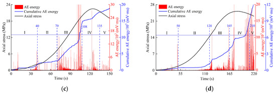 It can be seen from Figure 11 that the cumulative AE energy curves of the fissure specimens with different grouting materials generally show a downward concave step-type trend of change: the slope of the curve is small at low-stress levels; the growth rate of the curve increases gradually with the increase in axial stress; and the curve generally exhibits a slow then suddenly increasing trend as loading proceeds. According to the previous related literature [16,17,18], the curve is roughly divided into five stages: crack closure stage (I), elastic deformation stage (II), stable crack expansion stage (III), unstable crack expansion stage (IV), and post-peak damage stage (V). The AE characteristics of each stage are as follows: