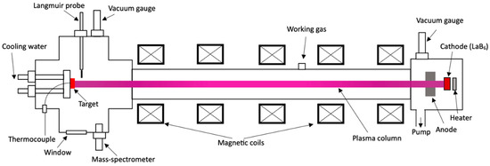 Among linear plasma generators, linear plasma installations with plasma generation controlled by an electron beam [12,13,14] have certain advantages as devices that allow the combination of plasma impacts and electron beams in tests with high thermal flux. In connection with this, a new laboratory linear plasma installation, KAZ-PSI, was developed and built for testing divertor candidate materials and conducting research on plasma–surface interactions.