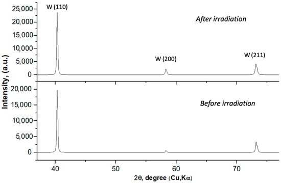 Diffractograms of tungsten before and after helium plasma irradiation at T = 1300 °C.