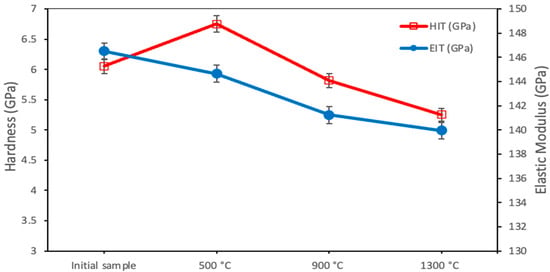 The hardness and elastic modulus of the tungsten samples were measured before and after irradiation with helium plasma (Figure 5). After irradiation at T = 500 °C, an increase in hardness by 10% and a slight decrease in elastic modulus was observed. The increase in hardness may be attributed to the development of mechanical stress due to helium accumulation in the near-surface layer of tungsten. It is known that the accumulation of helium in the near-surface layer leads to compressive stresses which reduce the elastic modulus and increase the hardness of the metal. After irradiation at T = 900 °C and T = 1300 °C, hardness and elastic modulus decrease depending on the temperature. This might be associated with structural changes, increased roughness, and an increase in the volume fraction of voids.