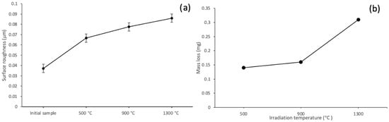 The assessment of surface erosion rate based on the loss of sample mass during irradiation is a commonly used technique in materials science. In this study, the weights of the samples were measured before and after irradiation, and the dependencies of the mass losses of the samples on the irradiation temperatures were obtained (Figure 6b). From Figure 6b, it is evident that the mass loss of tungsten increases with the rise in irradiation temperature. Moreover, the mass loss is negligible after irradiation at 500 °C and 900 °C. The degree of erosion increases after irradiation at 1300 °C, which is entirely expected. At high temperatures, tungsten atoms in the target undergo more thermal vibrations, making them more mobile. This increased mobility can influence the sputter yield and the behavior of sputtered atoms.