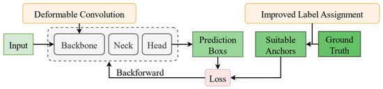 We devised two tricks to improve the detection accuracy of YOLOv5: incorporating deformable convolution into the backbone network and refining the label assignment strategy for samples. Figure 1 illustrates the framework of our approach. The introduction of appropriate deformable convolutions enhances the adaptability of the backbone network to accommodate diverse morphologies and poses of targets within images, and this advancement leads to improved detection results, particularly for categories exhibiting significant variations and challenging features. Simultaneously, the optimized label assignment provides more suitable learning targets for the model, ultimately resulting in higher detection accuracy. These combined improvements enhance the overall effectiveness and efficiency of the YOLOv5.