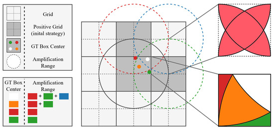 We firmly advocate for sample augmentation across grids to be conducted within the appropriate range. Previous studies have utilized a solid circle centered at the object’s center to define positive samples [27]. Moreover, it has been observed that pixels within the theoretical receptive field contribute to the output cell with an asymptotically Gaussian distribution [28]. Integrating the circle-like characteristics of the effective receptive field into the sample selection process would further enhance the quality of positive samples [29]. By incorporating these insights, the sample should be expanded into the positive sample because it can ‘feel’ the ground truth. Specifically, we draw a circle with the centroid of each grid as the center and a certain length as the radius. If the centroid of the ground truth lies within this circle, the associated anchors of that grid are expanded into positive samples, and this approach resembles the effective receptive field concept. Since the expanded ranges of multiple neighboring grids will form a shape similar to two petals when they overlap, we named it Petal-like Sample Amplication (PSA).
