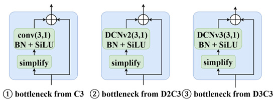 Composition of the three bottleneck structures. Depending on the version of deformable convolution operator, there are two types of modules, D2C3 and D3C3.