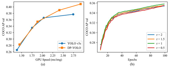 Comparison of DP-YOLO and YOLOv5s (a) and comparison of the effect of PSA with different values of PSA on training (b). COCO AP val denotes as the metric measured on the 5000-image COCO2017 val dataset over various inference sizes from 256 to 640. GPU Speed measures average inference time per image on COCO2017 val dataset using a GeForce RTX 3090 instance with a batch-size of 64.