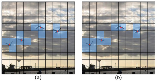 Comparison of Initial Positive Sample Amplification (a) and Petal-like Sample Amplication (value r = 1) (b). The red dot indicates the center point of the ground truth, while the light blue box indicates that anchors of these grids are considered available as positive samples.