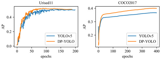 Figure 7 represents the progress of our approach during the training process, and we can see that there are some fluctuations in the training of DP-YOLO on the Urised11 dataset as the number of training epochs increases. However, this problem is smaller relative to YOLOv5, which may indicate that the size of this dataset needs to be expanded. In addition, this problem did not occur on the COCO2017 dataset, so we believe that DP-YOLO has good generalization ability and does not exacerbate overfitting.
