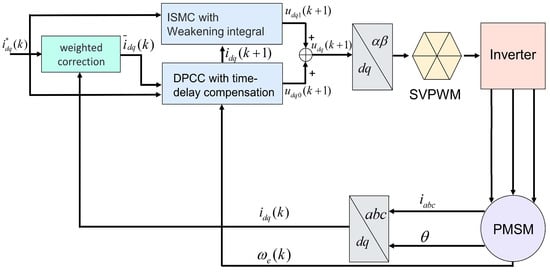 The available optimization methods that can be used to solve the abovementioned problems associated with DPCC include the model-free control method, parameter identification, disturbance observer compensation, etc. In [8], model-free control combined with a Luenberger disturbance observer is proposed to improve DPCC performance. This proposed method compensates the error by calculating the predictive control voltage and combining the estimated total disturbance with the ultra-local model. In [10], a parameter decoupling identification method is suggested to decouple and reduce the mutual influence between the stator inductance and the flux linkage, and it is optimized using the Kalman algorithm, which is effective in reducing the current steady-state error and harmonic content. In [11], a control method for the online updating of internal relevant parameters is suggested. This method uses an extended Kalman filter to filter the current, which is effective and easily implemented. In [12], a modified reaching law combined with a non-singular terminal sliding mode disturbance observer is used for compensation, and a harmonic compensation term is added to the current control output, which compensates the error and enhances the robustness of the system. In [13], voltage compensation and the elimination of steady-state error are achieved by improving the non-homogeneous disturbance observer, and a power reaching law is designed to make the system converge better. Some researchers have also achieved a boost by improving both the current and the speed loops. In [14], a speed sliding mode controller is designed to enhance the interference immunity while introducing a reaching law to compensate for the DPCC error. In [15], the speed and the current loop are controlled via SMC and DPCC, respectively, with a high-order sliding mode observer estimating and compensating for the disturbance of both, which improves robustness and current-tracking accuracy. Furthermore, an integral can be introduced for error compensation. In [16], the current error integral is introduced, and the parameter of the flux linkage is dynamically adjusted to cancel the error. In [17], a new method that introduces the current error into the control signal through an integral sliding mode term for error compensation is proposed. This method enhances robustness and guarantees the control capability. However, methods that introduce the integral term inevitably cause integral saturation when the error is large, and this affects the system control.