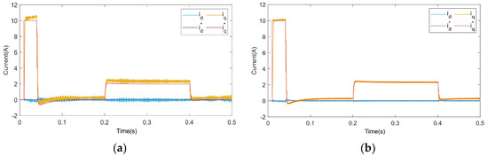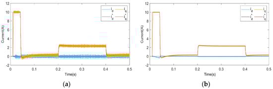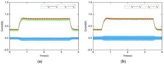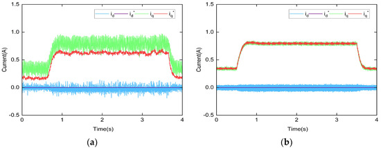 In order to demonstrate the effects of adding weight factors under a mismatch of the inductance parameters, a simulation of the inductance mismatch () of the predictive model was set under the following conditions: the rotational speed was 450 rpm and the load torque increased from 0 to 1 Nm at 0.2 s and decreased from 1 to 0 Nm at 0.4 s when the weight factors were . Figure 3a shows that the -axis feedback current under DPCC undergoes obvious fluctuations, while Figure 3b shows that the -axis feedback current does not undergo obvious fluctuations after weight factors are added. This shows that the impact generated by the inductance mismatch is suppressed, but it also shows the generation of certain steady-state errors.