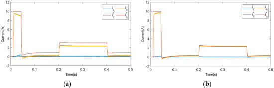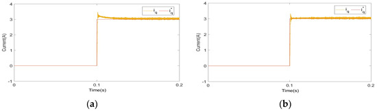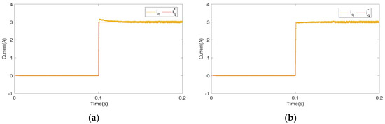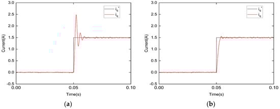 Simulation tests of the current loop were carried out to demonstrate that the weakened integral sliding mode structure improves the integral saturation and reduces the overshoot. The simulation conditions were such that the -axis reference current increased from 0 to 3 A at 0.1 s. Figure 4, Figure 5 and Figure 6 represent the -axis feedback and the reference currents when the three parameters of the model, namely inductance, resistance, and flux linkage, were not mismatched as well as when they were simultaneously mismatched. Figure 4a, Figure 5a and Figure 6a indicate the -axis feedback and the reference currents of the normal integral sliding mode optimization combined with the weight factors, and Figure 4b, Figure 5b and Figure 6b indicate the -axis feedback and the reference currents of the weakened integral sliding mode optimization combined with the weight factors. Moreover, methods (a) and (b) differ from each other only in the construction of the sliding mode surface. It can be seen in (a) that current overshooting occurs during current variation, while it is clear that in (b) the weakened integral sliding mode structure suppresses this phenomenon well.