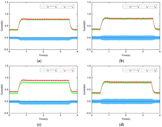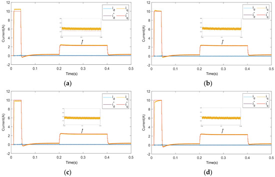 Figure 10 and Figure 11 represent comparisons of simulations about -axis currents between DPCC and DPCC optimized with weakened integral sliding mode compensation combined with weight factors under a rotational speed of 450 rpm and a load torque that increases from 0 to 1 Nm at 0.2 s and decreases from 1 to 0 Nm at 0.4 s, and for which the three parameters of resistance, inductance, and flux linkage are simultaneously mismatched. It can be shown that the proposed method can effectively eliminate the error and suppress the disturbance.