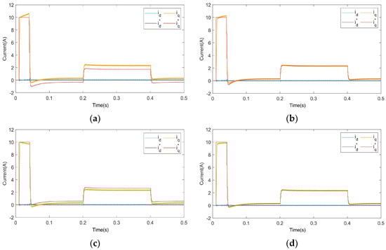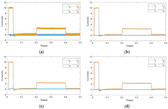 Comparison of -axis current simulations of two methods at 450 rpm with torque variation (1 Nm) for flux linkage mismatch. (a,b) ; (c,d) ; (a,c) DPCC; (b,d) DPCC with weakened integral sliding mode compensation combined with weight factors.