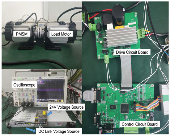 To demonstrate the effectiveness of the method involving weakened integral sliding mode compensation combined with weight factors suggested by the simulation, an experiment was performed using the PMSM experimental platform, shown in Figure 12, with a 750 W SPMSM. The motor electrical parameters are listed in Table 1. The power supply used a 60 V DC voltage source, the control board and the driver board used 24 V voltage input, the DSP control chip selected was a TMS320F28335, the PWM frequency was 10 kHz, the frequency of the speed loop was 1 kHz, the M method was used to measure the motor speed, the dead time was 3.2 us, and the weight factors were set as .
