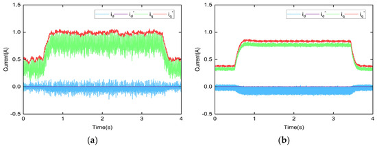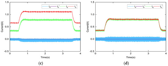 With the purpose of proving the effectiveness of introducing weight factors to suppress current fluctuation, the experiment was designed on the basis of the simulation. The DC voltage was set to 60 V, the rotational speed was set to 450 rpm, the load torque increased from 0.2 to 0.5 Nm at 0.5 s and then decreased from 0.5 to 0.2 Nm at 3.5 s, and the model inductance value was 1.4 times the stator inductance of the motor (). Figure 13a shows a large fluctuation in the -axis current in DPCC, which leads to system instability, while Figure 13b adds weight factors to DPCC, which can greatly reduce the current fluctuations, but which produce a certain amount of steady-state error.
