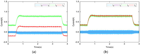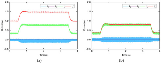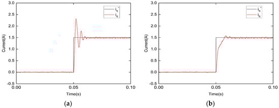 Experimental comparison of -axis currents of two methods under current variation (0 A to 1.5 A) without parameter mismatches (, , and ): (a) DPCC with normal integral sliding mode compensation combined with weight factors; (b) DPCC with weakened integral sliding mode compensation combined with weight factors.