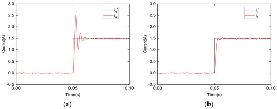 To effectively verify the feasibility of the anti-integral saturation of the weakened integral sliding mode, the current loop experiment was set up according to the simulation and the -axis reference current was increased from 0 to 1.5 A at 0.05 s. Figure 14, Figure 15 and Figure 16 indicate that the three parameters of the model were 1, 1.5, and 0.75 times the motor parameters, respectively, where current loops (a) and (b) were both optimized via DPCC using the sliding mode compensation and weight factors, and they differed only in their surface selection, with (a) using the ordinary integral sliding mode surface and (b) using the weakened integral sliding mode surface. As is shown in Figure 14, when there were no parameter mismatches, the overshoot of (a) was about 65.3% of the steady-state reference value, and the time to restore stability was about 0.012 s, while the overshoot of (b) was about 3.3% of the steady-state reference value, and the time to restore stability was about 0.006 s. Figure 15 shows that when the three parameters of the model were simultaneously changed to 1.5 times their actual values, the overshoot of (a) was about 53.3% of the steady-state reference value, and the time to restore stability was about 0.013 s, while the overshoot of (b) was about 4.3% of the steady-state reference value, and the time to restore stability was about 0.013 s. As can be seen in Figure 16, when the three parameters of the model were simultaneously changed to 0.75 times their actual values, the overshoot of (a) was about 67.3% of the steady-state reference value, and the time to return to stability was about 0.015 s, while (b) hardly produced any overshooting, and the time to return to stability was about 0.008 s. In terms of the time required to first achieve a steady-state value, it can be seen from the above three situations that (b) takes longer than (a). In terms of overshooting and the time needed to restore stability, it is clear that the weakened integral sliding mode surface not only weakens the overshoot due to the introduction of the integral term when the currents change, but that it also shortens the time required to reach a steady state.