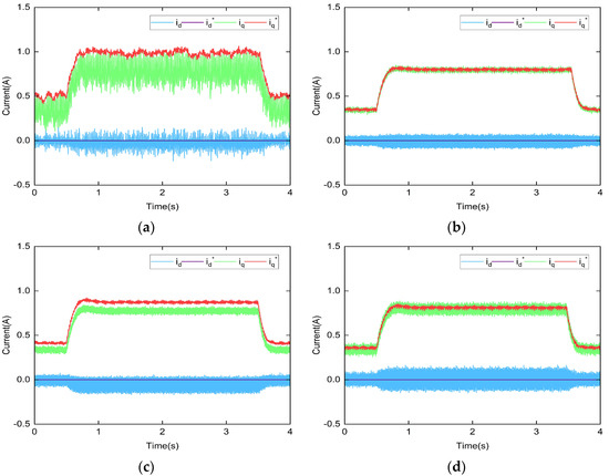 Experimental comparison of -axis currents at 450 rpm with torque variation (0.2 to 0.5 to 0.2 Nm) and flux linkage mismatch: (a,b) ; (c,d) ; (a,c) DPCC; (b,d) DPCC with weakened integral sliding mode compensation combined with weight factors.