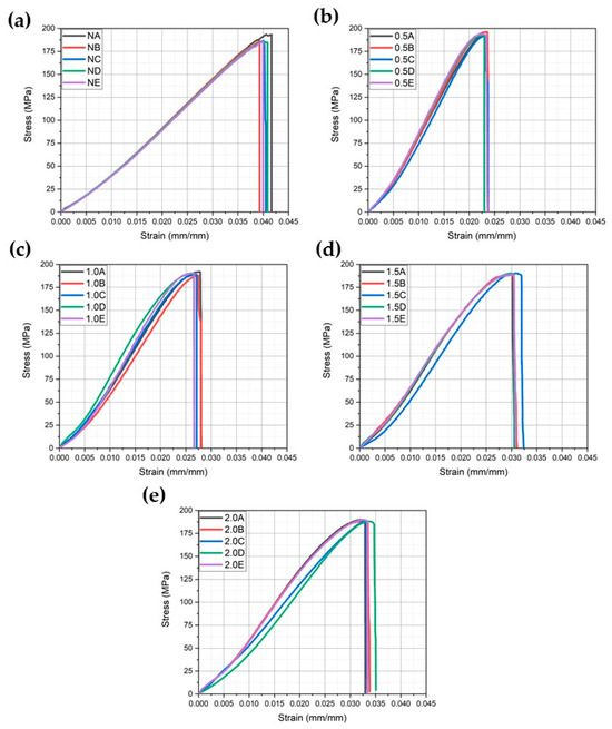 Stress–strain curves from tensile tests. (a) N specimens, (b) 0.5 specimens, (c) 1.0 specimens, (d) 1.5 specimens, and (e) 2.0 specimens.