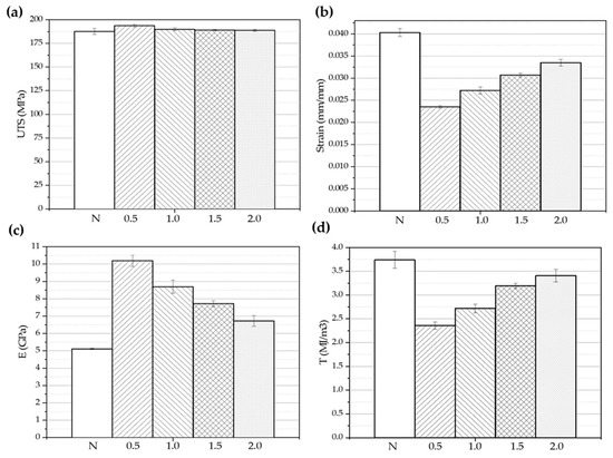 Mechanical properties comparison of the different samples obtained from the stress–strain diagrams, (a) UTS, (b) Young’s modulus, (c) strain, and (d) toughness.