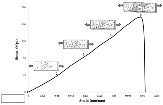 Figure 4 shows sketches of the evolution of the fracture in the N samples during the tensile test. The fracture mechanism is divided into five stages, starting from the zero point of the graph. Stage 1 corresponds to the starting point, where zero stress equals zero deformation; separation phenomena between the stitching and the matrix occur as the tensile stress increases. At stage 2, due to the stresses generated in the center of the sample, pre-cracking on the matrix begins to appear, and there is little matrix detachment, making internal pull-out fibers occur. The pre-cracking has trajectories like the direction of the fibers within the composite. In stage 3, small fractures in the matrix within the direction of the fibers appear, and transversal cracks are formed, which contribute to the detachment of a greater amount of matrix from the composite, resulting in internal fiber pull-out. During stage 4, the fibers externally pull out due to bigger fractures and cracks, and matrix detachment begins. This is a chain reaction that ends at stage 5 by separating the sample into two parts, and the crack line coincides with the direction of the reinforcing fibers.