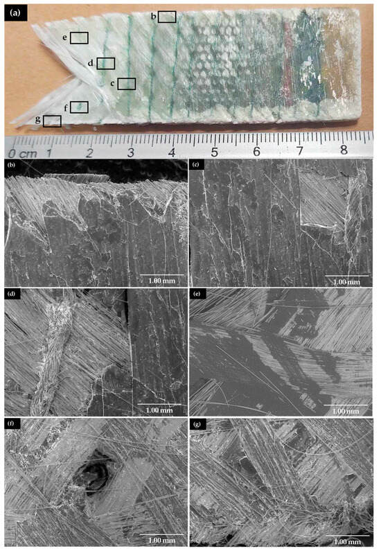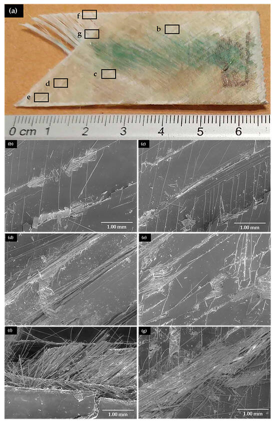 Figure 5 shows the SEM images of the fracture analysis of the N sample, where stages 3, 4, and 5 were identified as shown in Figure 4. Figure 5a shows a fractured NA specimen, where we can observe the beginning of the fibers pulling out from the matrix on the surface of the fracture, in addition to the areas that correspond to where each of the stages of the fracture are located. This is because the fracture of a composite material is progressive, starting from the center of the specimen and moving to its end. Figure 5b,c correspond to stage 3 of the fracture, where cracks are observed in the direction of the stitching and vertical cracks that favor the detachment of the matrix. Figure 5d,e correspond to zone 4 of the fracture, where the detachment of the matrix and pull-out of the fibers are observed, indicating the material’s weakening. Figure 5f,g correspond to the fracture, where the fibers are observed to be separated from the matrix, resulting in delamination [30].
