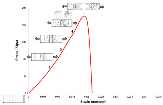 In stage 4, cracking increases in the areas surrounding the stitching and in the transverse direction of the sample, as well as the detachment of the matrix; this can be observed in stage 4 of Figure 6. At this stage, the external pull-out phenomenon begins in the stitching, which is considered to be a chain reaction. In stage 5, the fracture of the stitched samples is represented, where it is observed that in the fracture, there is greater detachment of the matrix due to the concentration of stresses in the stitching.