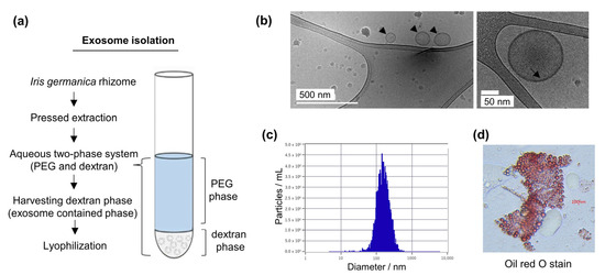 Isolation and characterization of Iris germanica L. rhizome-derived exosome. (a) Isolation of Iris germanica L. rhizome-derived exosome. (b) Representative image of Iris germanica L. rhizome-derived exosome visualized using Cryo-TEM (scale bars, 500 nm and 50 nm). Iris-exosomes are pointed by black arrows within the image. (c) A graph showing the results derived with NTA of Iris-exosomes. (d) Iris-exosomes were stained with oil red O and visualized using a microscope (scale bar, 100 nm).