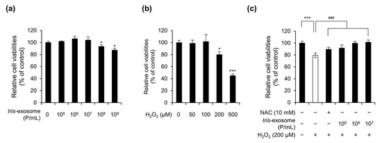 Before analyzing the effects of Iris-exosomes on H2O2-induced cellular stress in nHEKs, we assessed the potential cytotoxicity of the nHEKs treated with Iris-exosomes for 24 h. As shown in Figure 2a, nHEKs treated with a concentration of less than 107 (particles/mL) showed no cytotoxicity. In order to evaluate the effect of H2O2 on nHEKs, cell viability was determined via 24 h treatment with various concentrations of H2O2. Consequently, cell viability was reduced by 80% at 200 µM (Figure 2b). Therefore, 105, 106, and 107 Iris-exosomes were used in the following experiments along with 200 µM H2O2. The MTT assay was performed on the nHEKs to determine whether the exosome treatment could recover the reduction in cell viability caused by H2O2. The viability of nHEKs pretreated with Iris-exosomes increased in a concentration-dependent manner compared with that of cells treated with H2O2 alone (Figure 2c). These results indicate that Iris-exosomes have protective effects against the H2O2-induced loss of cell viability in nHEKs.