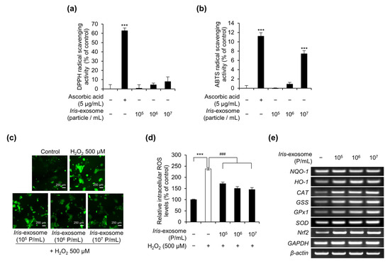 Our previous results led us to investigate the antioxidant potential of Iris-exosomes. The DPPH and ABTS assays were initially conducted to determine whether Iris-exosomes possess a radical scavenging effect. The Iris-exosomes showed concentration-dependent scavenging activity against DPPH and ABTS radicals but revealed a less potent overall effect than L-ascorbic acid (Figure 3a,b). To determine whether exosomes can scavenge intracellular ROS in nHEKs, a DCF-DA assay was conducted in which nHEKs were pretreated using Iris-exosomes for 4 h and then exposed to 500 μM H2O2 for 30 min. As shown in Figure 3c,d, the increased DCF fluorescence intensity caused by the H2O2 treatment decreased in the Iris-exosome-treated cells in a concentration-dependent manner. To confirm whether these results could be explained by the expression of antioxidant-related genes in the cells, several antioxidant-related genes were measured after Iris-exosome treatment. HO-1, CAT, GSS, GPx1, SOD, and Nrf2 were transcriptionally upregulated in nHEKs following Iris-exosome treatment (Figure 3e). According to these results, it can be said that Iris-exosomes appear to exert a protective effect against cellular oxidative stress caused by H2O2.