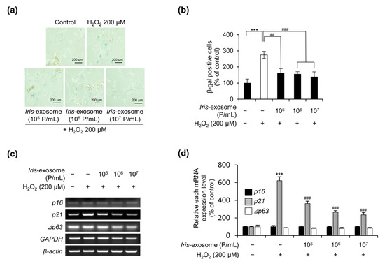 In addition to assessing their radical scavenging activity in the intracellular environment, we investigated whether Iris-exosomes could protect nHEKs against oxidative-stress-induced cellular senescence. nHEKs were treated with various concentrations of Iris-exosomes and/or 200 µM H2O2, and senescence-associated β-galactosidase (SA-β-gal) assay was conducted to examine the SA-β-gal-positive senescent cells. The results indicate that H2O2 treatment only increased the number of senescent cells to 274.78% of the total reached in the untreated control group (100.00%); however, Iris-exosome-pretreated nHEKs reduced the number of senescent cells to 160.31%, 155.16%, and 138.37% (Figure 4a,b). It is well-known that p16 and p21 act as a cell cycle-dependent kinase inhibitor. RT-PCR was used to confirm these results via the analysis of the expression levels of senescent markers (p16 and p21). The results shown in Figure 4c,d indicate that the mRNA expression of p21 decreased concentration-dependently in the Iris-exosome-pretreated cells compared to the H2O2-treated cells. These results suggest that Iris-exosomes protect nHEKs against intracellular ROS production and cellular senescence induced by H2O2.