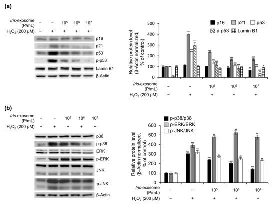 nHEK cells were pretreated using the indicated concentrations of Iris-exosomes for 4 h, after which they were treated with 200 μM H2O2 for another 4 h. After 40 h of further incubation, the cells were harvested, and total proteins were lysed using radioimmunoprecipitation assay (RIPA) buffer containing protease inhibitors. Total protein quantification was performed using a Pierce BCA Protein Assay Kit (Thermo Fisher Scientific). Samples containing 20 µg of protein were separated via sodium dodecyl sulfate (SDS)–polyacrylamide gel electrophoresis, and the proteins were then transferred onto a polyvinylidene fluoride (PVDF) membrane. These membranes were blocked using 2% skim milk in Tris-buffered saline with Tween 20 (TBST) buffer and incubated with the corresponding primary antibodies overnight at 4 °C. Then, the membranes were incubated with a horseradish peroxidase (HRP)-conjugated secondary antibody. The Western blot results were analyzed using enhanced chemiluminescence (ECL) solution (Thermo Fisher Scientific) and visualized using a chemiluminescence detector. The antibodies used were as follows: ERK (1:1000, CST), p-ERK (Thr202/Tyr204)(1:1000, CST), p16 (1:1000, CST), Lamin B1 (1:1000, Abcam), p21 (1:1000, CST), Nrf2 (1:1000, CST), p53 (1:200, Santa Cruz), p-p53 (Ser15), (1:1000, CST), p38 (1:1000, CST), p-p38 (T180/Y182), (1:1000, CST), JNK (1:1000, CST), p-JNK (T183/Y185), (1:1000, CST), Cytokeratin 1 (1:1000, Abcam), Cytokeratin 10 (1:1000, Abcam), Loricrin (1:1000, Abcam), and β-actin (1:1000, Santa Cruz). Quantification of protein level was conducted with ImageJ software (ImageJ 1.52a, National Institutes of Health, Bethesda, MD, USA).