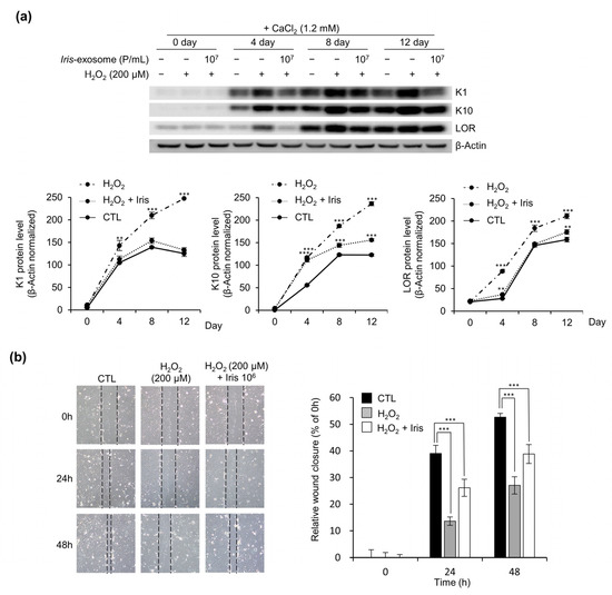 Keratinocytes play important roles in epidermal differentiation and skin regeneration. Oxidative stress induced by hydrogen peroxide causes premature keratinocyte senescence and abnormal terminal differentiation [25,27]. According to our findings, Iris-exosomes protect nHEKs from oxidative stress and cellular damage. Therefore, we tested whether Iris-exosome exerts protective effects against H2O2-mediated cell dysfunction during differentiation and regeneration. First, to determine whether Iris-exosomes could restore the abnormal differentiation caused by H2O2 treatment in nHEKs, Western blotting was performed to target differentiation markers in nHEKs treated with CaCl2 (1.2 mM) for 12 days. In the presence of CaCl2, a significant increase in the expression of the intermediate differentiation markers K1, K10, and LOR was observed on days 8 and 12 after treatment with CaCl2 (Figure 6a). Interestingly, compared to the control cells (CaCl2-treated only), we found that the H2O2-treated group showed early signs of upregulated intermediate differentiation markers, K1, K10, and LOR proteins, on day 3 after treatment with CaCl2 (Figure 6a). Iris-exosomes, however, attenuated the early increase in the expression levels of the differentiation markers caused by H2O2 to levels similar to those of the control group (Figure 6a). Then, we tested the protective effects of exosomes against H2O2-induced cellular damage using a wound-healing assay. We treated nHEKs with Iris-exosomes for 4 h, treated them with 200 µM H2O2 for 4 h, and then scratched them with a sterile pipette tip. The change in the gap width after 48 h was used to determine wound-healing ability. The results show that groups treated with Iris-exosomes had higher scratch closure rates than those treated with H2O2 alone (Figure 6b). Altogether, these results indicate that Iris-exosome is a bioactive component found in Iris germanica L. rhizome, displays limited cytotoxicity, and exhibits a protective effect on oxidative-stress-induced cellular dysfunction in nHEKs.