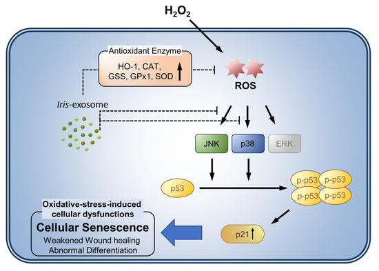 In nHEKs, ROS produced by H2O2 activate the intrinsic pathway of oxidative stress. The Iris-exosomes increase the levels of antioxidant enzymes, such as HO-1, CAT, GSS, GPx1, and SOD, which regulate the levels of intracellular ROS. Furthermore, increased wound-healing activity and normal differentiation of skin cells are associated with Iris-exosome treatment, which mitigates oxidative stress induced by H2O2. Additionally, Iris-exosomes inhibit cellular senescence via modulating the p38/JNK MAPK pathway, resulting in reducing the levels of p53 and p21.