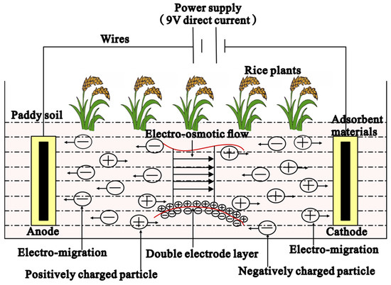 Currently, remediation of heavy metal pollution in paddy soil focuses on Cd remediation, commonly with the use of agronomic control and soil amendment technologies. Agronomic control includes crop variation [7], optimized fertilization [8,9], and foliar obstruction control [10]. Soil amendment includes chemical leaching [11], in situ passivation [12], plant enrichment [13,14], and electrokinetic remediation [15,16]. Electrokinetic remediation is an emerging in situ technology developed in recent years. It consists of inserting cathodes and anodes of an electric field into Cd-contaminated soil. The application of a direct current facilitates the directional migration of the Cd element toward electrodes due to electromigration, electro-osmotic flow, and electrophoresis in the electric field. Electromigration indicates the movement of charged ions and ionic complexes in soil solutions under the existence of an applied electric field, and it is the dominant transport mechanism for inorganic contaminants [17]. Electro-osmotic flow is the movement of the soil solution containing dissolved pollutant species through the pore system of the soil [18]. For soil heavy metal remediation, metal, or metal-containing species are usually positively charged and therefore migrate to the cathode through electromigration and electro-osmosis (electric attraction) [19]. Electrophoresis refers to the movement of charged particles or colloids under the application of an electric field. Compared with electromigration and electro-osmosis, electrophoresis has a negligible impact on inorganic matter transport in low-permeability soil systems, and thus it is not taken into account in the electrokinetic remediation process [17]. The Cd element is accumulated near the electrodes, and then the pollutants in the soil or electrolyte in the enrichment area are treated centrally to remove them [20].