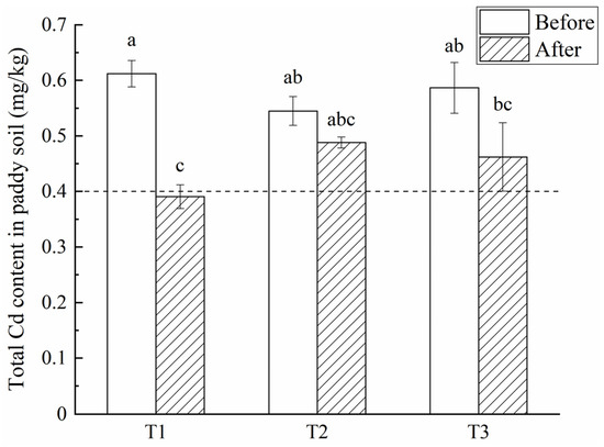 Variation in total Cd content in the soil of experimental groups before and after treatment (T3 was control group). Different letters above the error lines indicate significant differences (p < 0.05). The dashed line indicates the legal limit of Cd in the agricultural soil (0.4 mg/kg is derived from the Chinese national standard GB 15618-2018).
