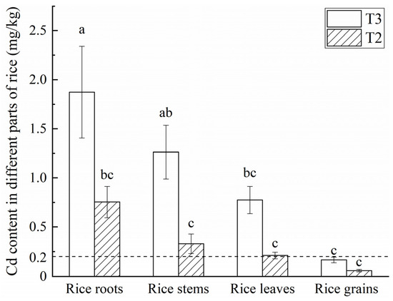 Variations in Cd contents in various tissues and organs of rice. The T3 group was the control group, and the T2 group used the geo-electrochemical technology. Different letters above the error lines indicate significant differences (p < 0.05). The dashed line indicates the legal limit of Cd in brown rice (0.2 mg/kg is derived from the Chinese national standard GB 2762-2022).