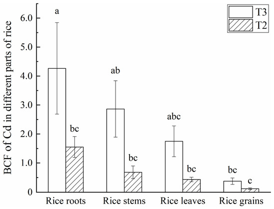 Variation in Cd bioconcentration factor in various tissues and organs of rice. The T3 group was the control group, and the T2 group used the geo-electrochemical technology. Different letters above the error lines indicate significant differences (p < 0.05).