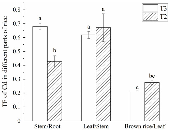 The capacity of heavy metals to accumulate and be transported to different parts of rice can be reflected by the bioconcentration factor (BCF) and the translocation factor (TF) [40]. The BCF is the ratio of the heavy metal element content in various rice organs to the heavy metal element content in the soil. It can be used to characterize the difficulty of heavy metal element migration in the soil–rice system. The larger the coefficient, the stronger the ability of heavy metals to migrate from the soil to the plant. The BCF of Cd in various tissues and organs of rice in the T2 and T3 experimental groups is shown in Figure 5. According to Figure 5, there was a certain difference in the Cd BCF in various tissues and organs of rice in the T3 control group, which did not use the GT, and the T2 experimental group, which used the GT. In both experimental groups, the Cd BCF in rice plants from high to low was in the order of rice roots > rice stems > rice leaves > rice grains (brown rice), which is consistent with the change characteristics of Cd content in various parts of rice discussed in Section 4.2. At the same time, according to Figure 5, relative to the T3 control group, the Cd BCF in various parts of rice in the T2 experimental group decreased, among which the decrease in the root BCF was the most significant (p < 0.05). That shows that the GT had an influence on the accumulation capacity of Cd in the paddy soil in various tissues and organs of rice.