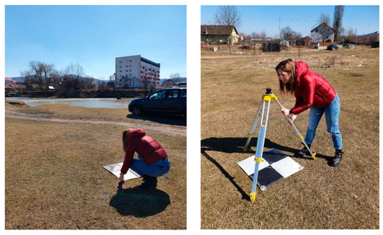The most important thing when starting any topographical work is the reconnaissance of the terrain. This was performed in the case of the measurements in this paper, carefully choosing the areas where the six control points were mounted, as they would later be useful for the georeferencing of the resulting orthophoto plane. Three reference points were installed on the left bank of the Someș River and the other three on the right bank. The areas of the control points were carefully chosen, aiming to choose an open area to ensure the easy visibility of the targets from the drone. The points were materialized by targets printed on a resistant material in the grass and dirt areas (