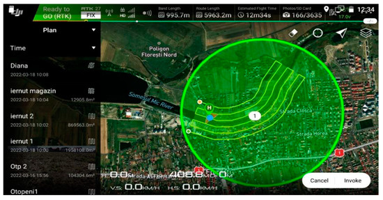After determining the coordinates of the six control points using the static mode, the actual flight was started. The first step in making the flight was approval from the Romanian Civil Aeronautical Authority (AACR). For the aerial images to be of the highest possible quality, the weather conditions were monitored both the evening before and the morning of the flight because too aggressive wind and precipitation can affect the actual flight. The take-off and landing area was chosen in an open area, without trees and vegetation to be able to monitor the drone from the immediate vicinity of the take-off point, which is the same as the landing point. As can be seen in