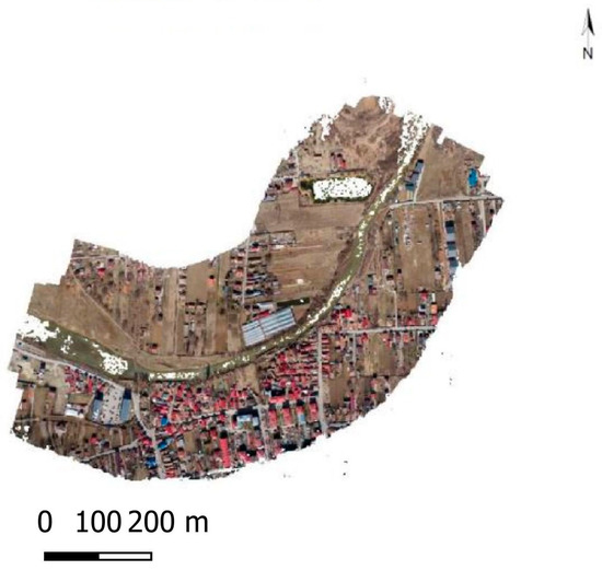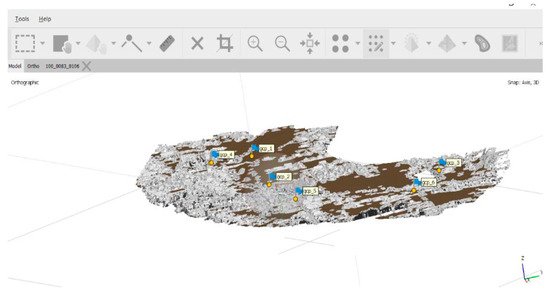 Therefore, all the stages necessary for the generation of the orthophoto plane were completed, with each stage having its own characteristics. At the beginning of the process, 185 aerial photographs were aligned, generating 232,347 points, representing the totality of drone position points and image intersections. The ultra-high-quality point cloud was then built, generating a volume of 561,249,646 points, which then produced 154,314,192 faces of the mesh. The mesh was used to build the tilted model with a diversity of nine levels and a resolution of 3.16 cm/pixel. From this model, the DEM was obtained with a plane resolution of 57,438 × 51,180 and a terrestrial resolution of 3.16 cm/pixel.