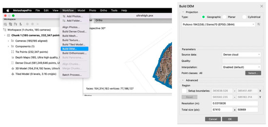 Figure 6). With the help of the previously generated structures, the DEM (Digital Elevation Model) was drawn. The georeferencing system used was Pulkovo 1942 (58)/Stereo 70. Relatedly, the cloud of points needed to use some classifications in the case of the DEM as well. Finally, the steps taken previously to achieve the graphic format of the measurements obtained with the help of UAV technology led to the acquisition of the orthophoto plane.