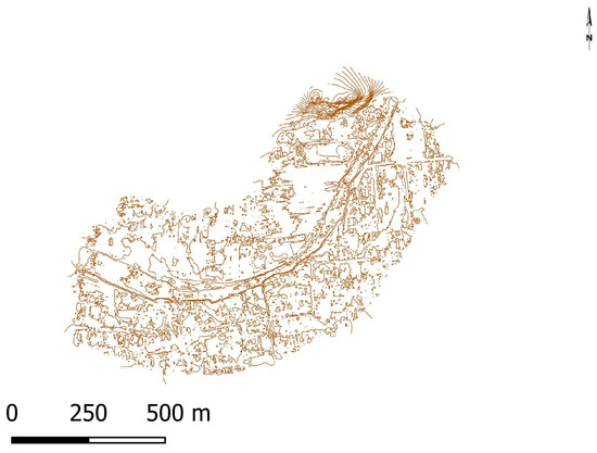 Figure 8). These contour lines were created in the Global Mapper 23 program (Blue Marble Geographics, Hallowell, ME, USA). To create the level curves, the authors decided to use the DEM exported from the AgiSoft Metashape 1.8.5. program, saved with the “.tiff” extension.