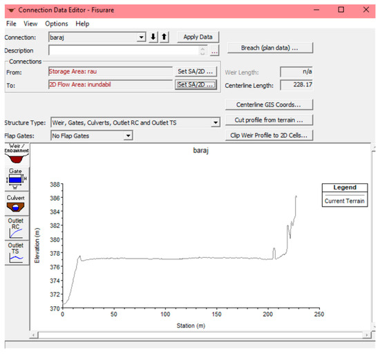 The next step consists of defining the area of the studied dam, accessing the “Tools” → “SA/2D Conn” option, and then generating a polyline in the middle of the dam so that this function connects the two previously mentioned areas, namely, the area of the Someș River and the flood area. After making the connection between the zones, it was necessary to create a boundary that defines the end of the flood zone (