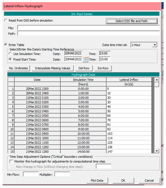 The main conditions that the program imposes are the internal limits, represented in this case by the Someș River, and the external limits of the flood zone. Each of these limits is set according to each one, namely, the internal one by the flow of water from the river, reported in a time interval, and the external one by the friction of the water with the flood zone. The graphic representation was made with the help of the “BC Lines” function, with the condition that the outer limit should be perpendicular to the axis of the water flow and at a height as high as possible, so that, in the end, the spread of water does not reach the boundary of the polygon that includes the flood zone. If these conditions are not respected, the risk will be the occurrence of errors. The simulations considered extremely important elements that can define a flood, such as the friction force of the water and the flow speeds.