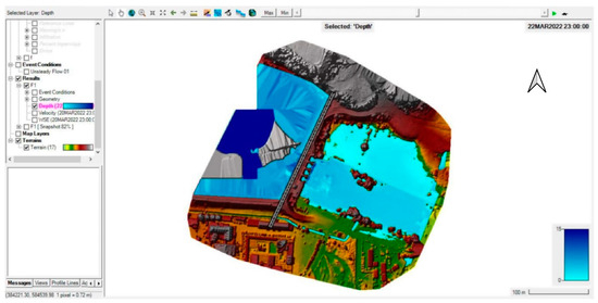 Next followed the setting of the minimum elevation, namely, 335.00 m as previously presented, and then it was possible to initialize the simulation. The time intervals for the flood and crack process were then set and then the processing time was set to 15 s.