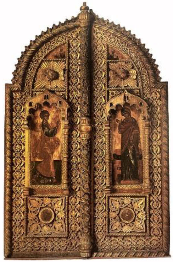 - Nikonanos, N. Bema doors, Chelandari Monastery. In Treasures of Mount Athos, 2nd ed.; Holy Community of Mount Athos, Ministry of Culture Museum of Byzantine Culture, Organization for the Cultural Capital of Europe Thessaloniki: Thessaloniki, Greece, 1997; pp. 270–272. Available online: https://www.elpenor.org/athos/en/e218bh5.asp (accessed on 15 October 2020).